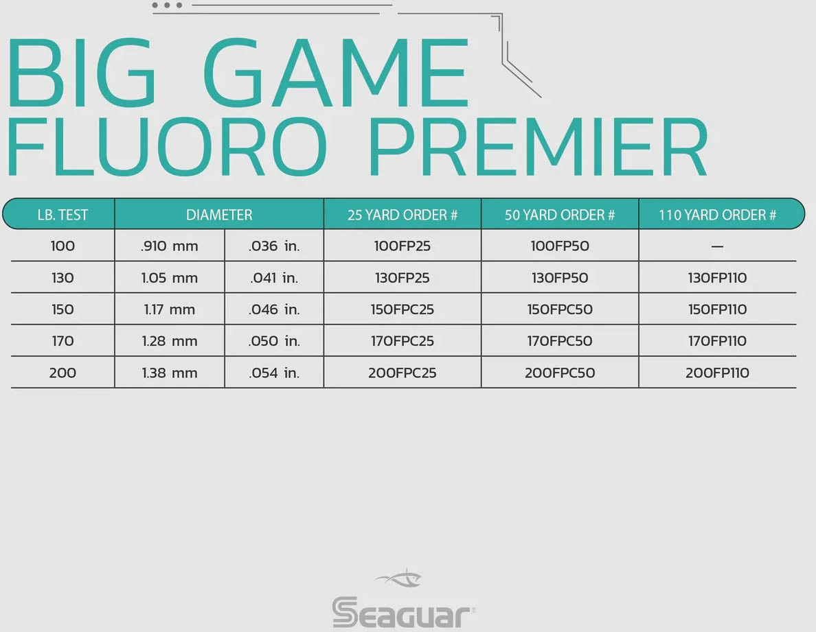 Developed with Seaguar’s exclusive, proprietary Double Structure Technology, Seaguar Fluoro Premier Leader is premium saltwater fishing leader material that represents the current zenith of fluorocarbon leader innovation. Specifically, Fluoro Premier has much smaller diameters and increased strength when compared to Seaguar’s Blue Label and Red Label leaders and is the expert salt anglers choice when they want an unbeatable presentation when it comes to both stealth and strength.
